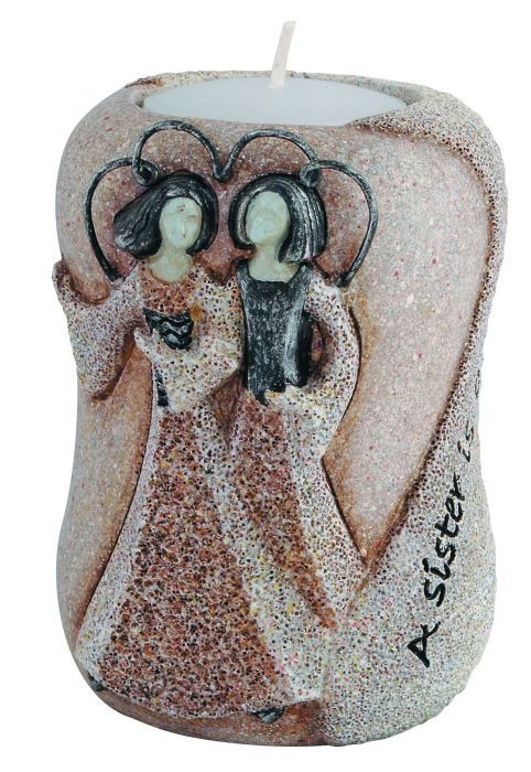 The sentimental Sister t-lite holders are the perfect gift to show your feelings. This is functional and inspirational. Each t-lite holder is made from Artstone and is approximately 3&1/2" x 2&1/2".