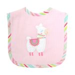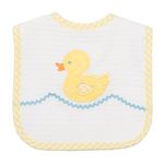 The feeding bibs have an easy hook and loop closure and are double-sided. The front has an embroidered applique and the back is a thick, cotton terry. The thickness of the bibs keeps babies' clothes clean and the terry back can be used for wiping babies' mouths and any other feeding mishaps.