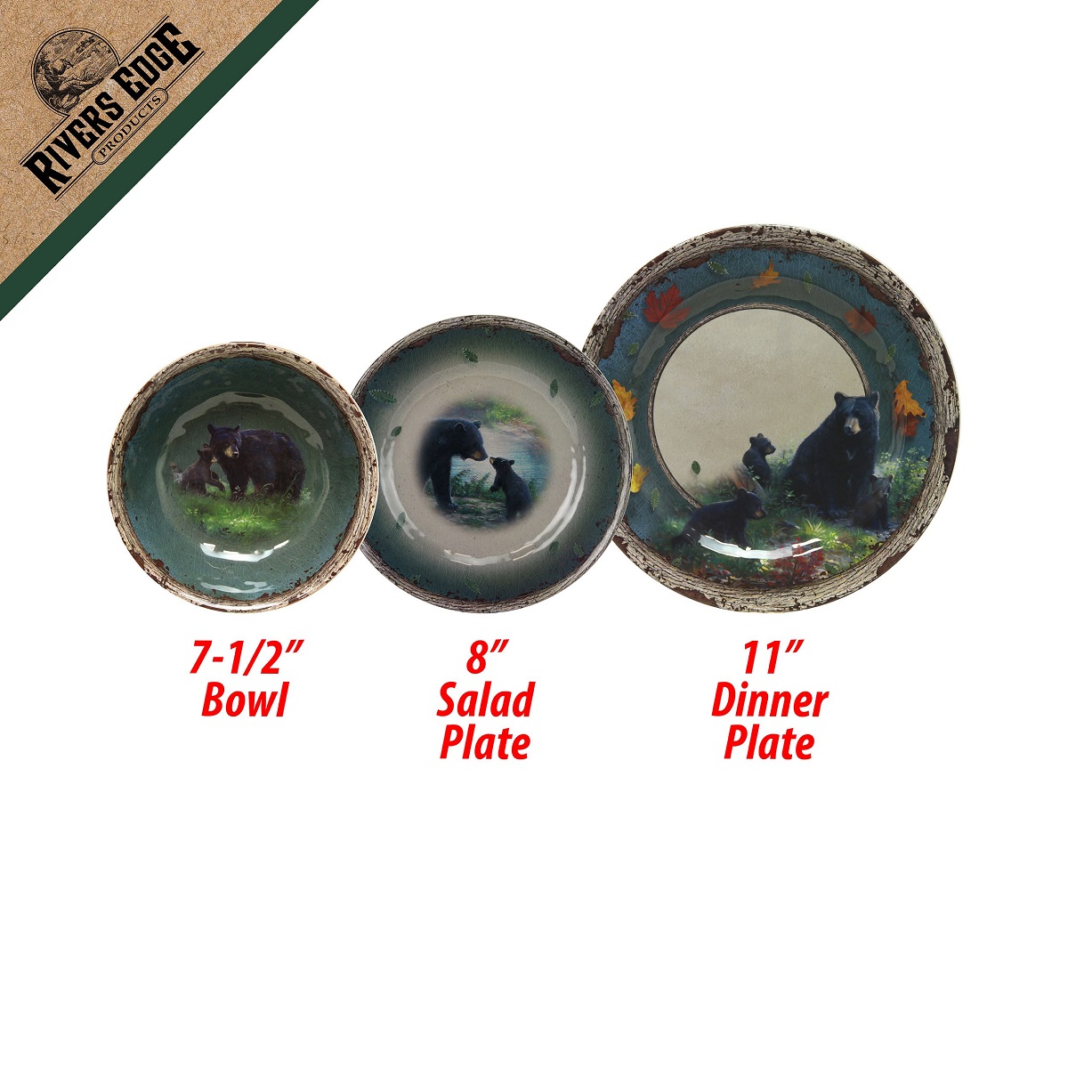 The melamine dinnerware set from River's Edge Products is a durable, heavyweight, 100% melamine dinnerware set featuring black bear themed artwork courtesy of JQ Licensing. Dishwasher safe, although handwash is recommended, and very resistant to breakage and chipping, this dinnerware is as functional as it is great looking. Easy clean-up and safe for all food uses, each set includes four 11 inch dinner plates, four 8.5 inch salad plates, and four 7.5 inch bowls. Do not microwave. Other matching pieces available include trays, platters and bowls.