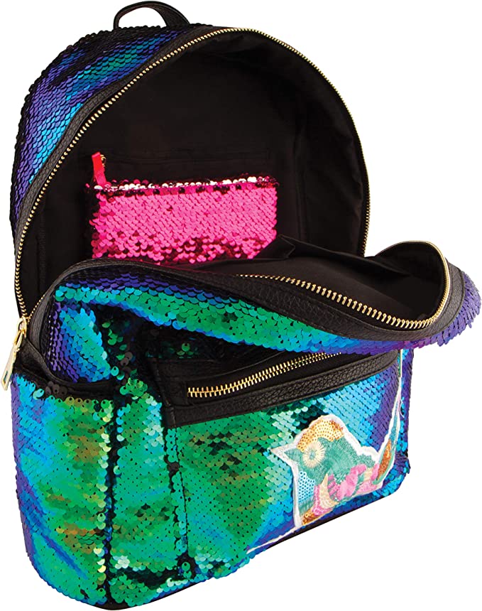 The Fashion Angels Magic Sequin Collection is the new trend taking over social media and the Mini Backpacks are a must-have for girls of any age. The added embroidered patches make this mermaid colored magic sequin mini backpack a fashion must have. Swipe the magic sequins to change color from blues to sea greens.
