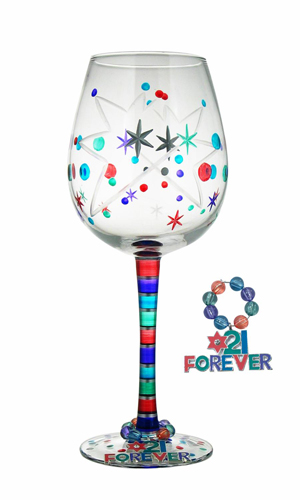 My Special Moments Forever 21 Wine Glass by MoMo Panache is a beautiful edition to there classy collection. Each glass is mouth blown, hand cut and hand painted. So each glass is an original. A colorful Forever 21 wine charm comes with each glass. It is elegantly boxed with a lovely color coordinated bow on top. Holds 14oz.