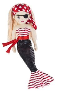 Ganz Shimmer Cove Mermaid Dolls are a collection of beautiful mermaids. Each mermaid is unique in her design. Each girl is ready for her next adventure into any world your imagination can take you, or simply to bed as a snuggle partner waiting for tomorrows adventure! Meet Pirate Shelly! Her long blonde braided hair adorned with a red polka dot bandana, her shiny red/white top and shimmer black shell skirt with a shiny red/white fin! Approximately 18" in length. Surface washable.