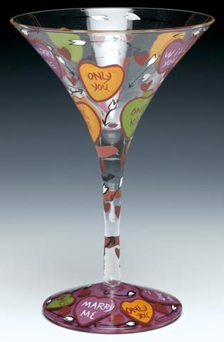 Lolita Love Martini Glass features a design inspired by a delicious martini recipe, which is printed on the bottom of the glass! Each martini glass holds approximately 7 ½ ounces of your favorite martini and each comes distinctively gift boxed. The glasses are hand-painted with food-grade non-toxic paint.