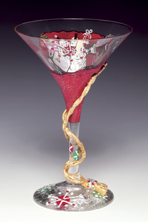 Santa’s New Bag Martini Glass holds approximately 7 oz. It is hand painted with a special martini recipe on the bottom and has decorative cording with a charm on the stem. Gift boxed in a distinctive decorative box. What will you get out of Santa's New Bag this year?