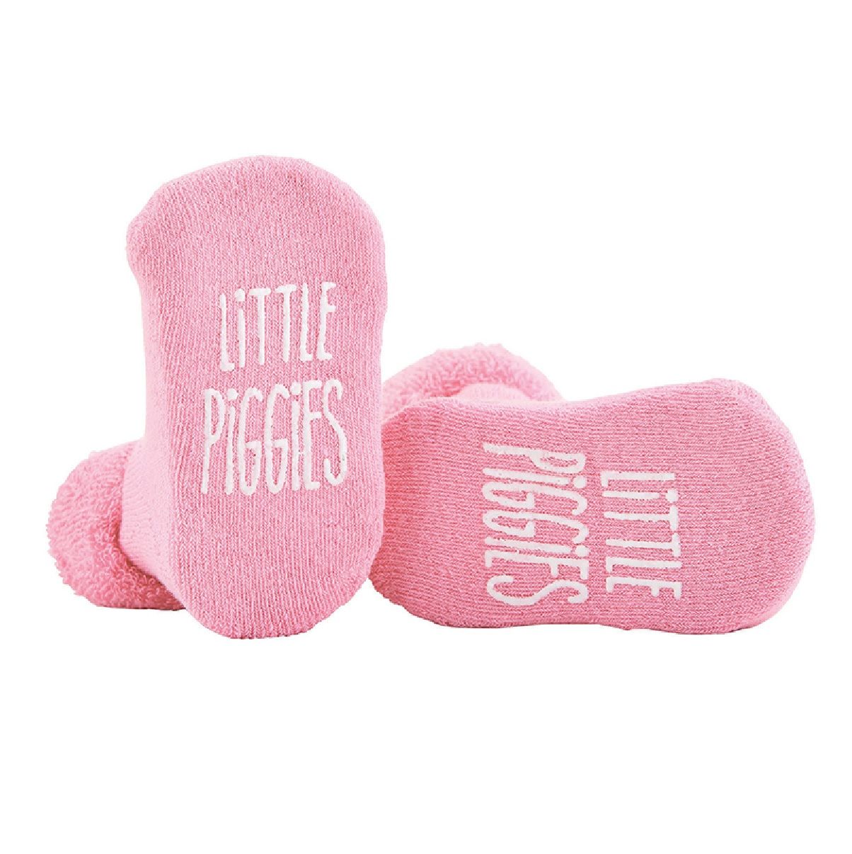 Pink with non-slip printing on bottoms. Features the phrase "Little Piggies".