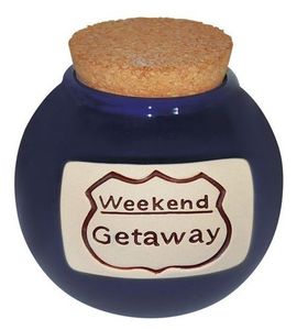 This jar is 5" x 5" and is stamped with the words "Weekend Getaway." Colors may vary.