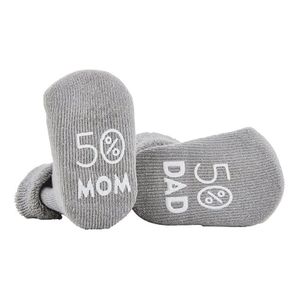 Gray with non-slip printing on bottoms. Features the phrase "50% Mom and 50% Dad".